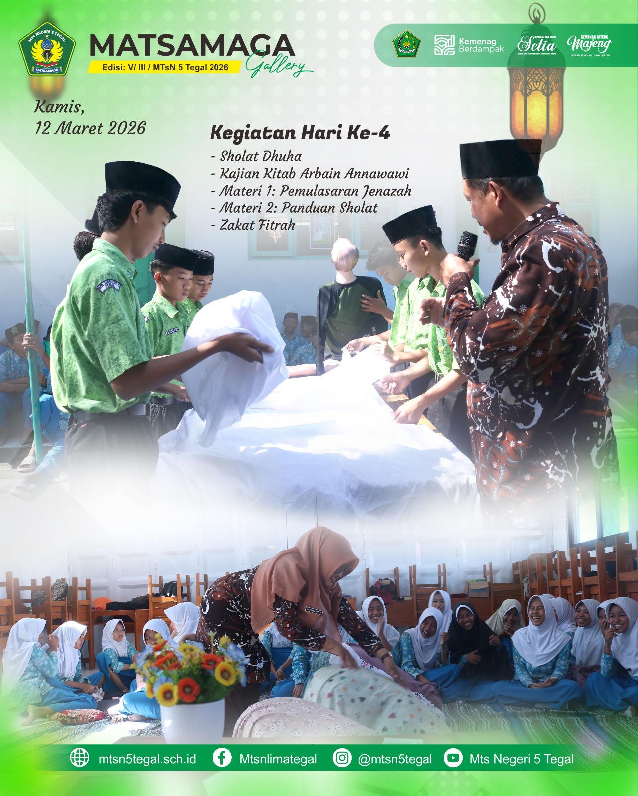 Pangkah, Kamis (12/3) — Kegiatan Pesantren Ramadan di MTsN 5 Tegal memasuki hari keempat dengan rangkaian aktivitas keagamaan yang tetap diikuti dengan antusias oleh seluruh siswa. Kegiatan ini menjadi bagian dari upaya madrasah dalam menanamkan pemahaman serta praktik ibadah secara langsung kepada para siswa.